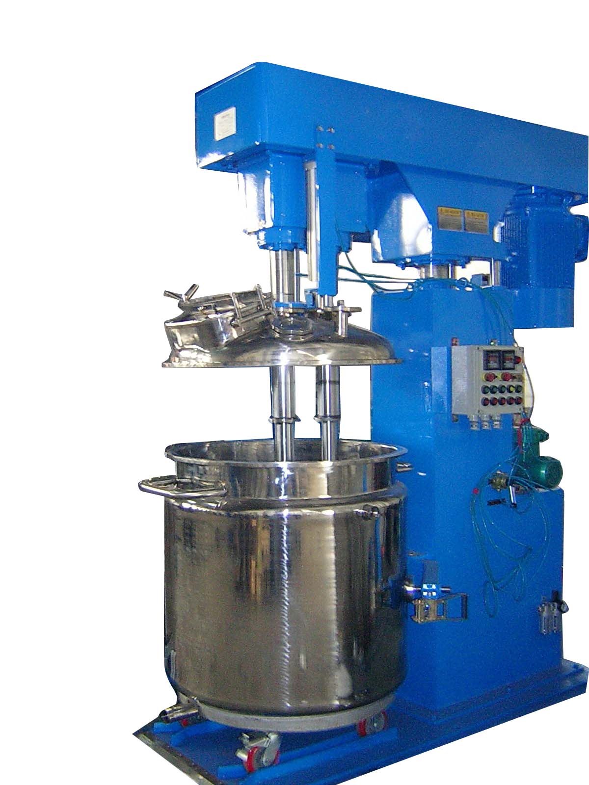 Vacuum disperser scope of paints, dyes , pigments, paints , inks , adhesives , resins, creams , cosmetics , paper, food , rubber , composite materials , insulation materials, magnetic materials , other colorants and other chemical industry products, liquid - wet solid dispersion , grinding , stirring , homogenizing , mixing , dissolving processing equipment is also used for more volatile solvents bubble material more easy process , so that the material is evacuated through the vacuum vessel in the dispersion , to reduce the bubbles and volatile solvent , by dispersing fineness of dispersion of the material can be accelerated vacuum state , so that the material quickl
